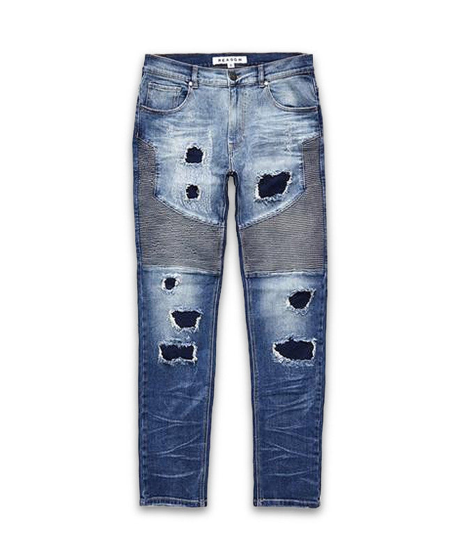 Premium washed and hand finished denim. Features moto biker construction on legs, rip and repaired distressing, and a Straight leg cut with a slight stretch. Fits true to size.