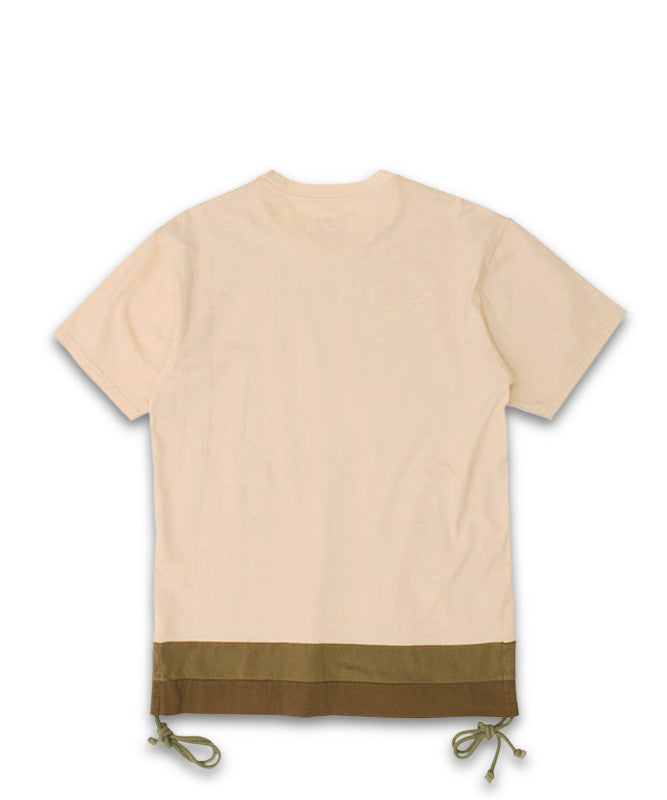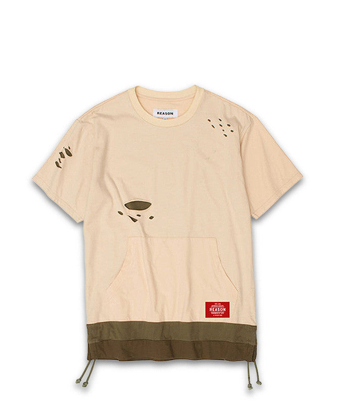 Garment dyed short sleeve distressed layered tee. Features side seam strings, front kangaroo pocket, and red contrast label.