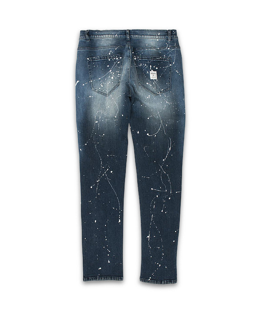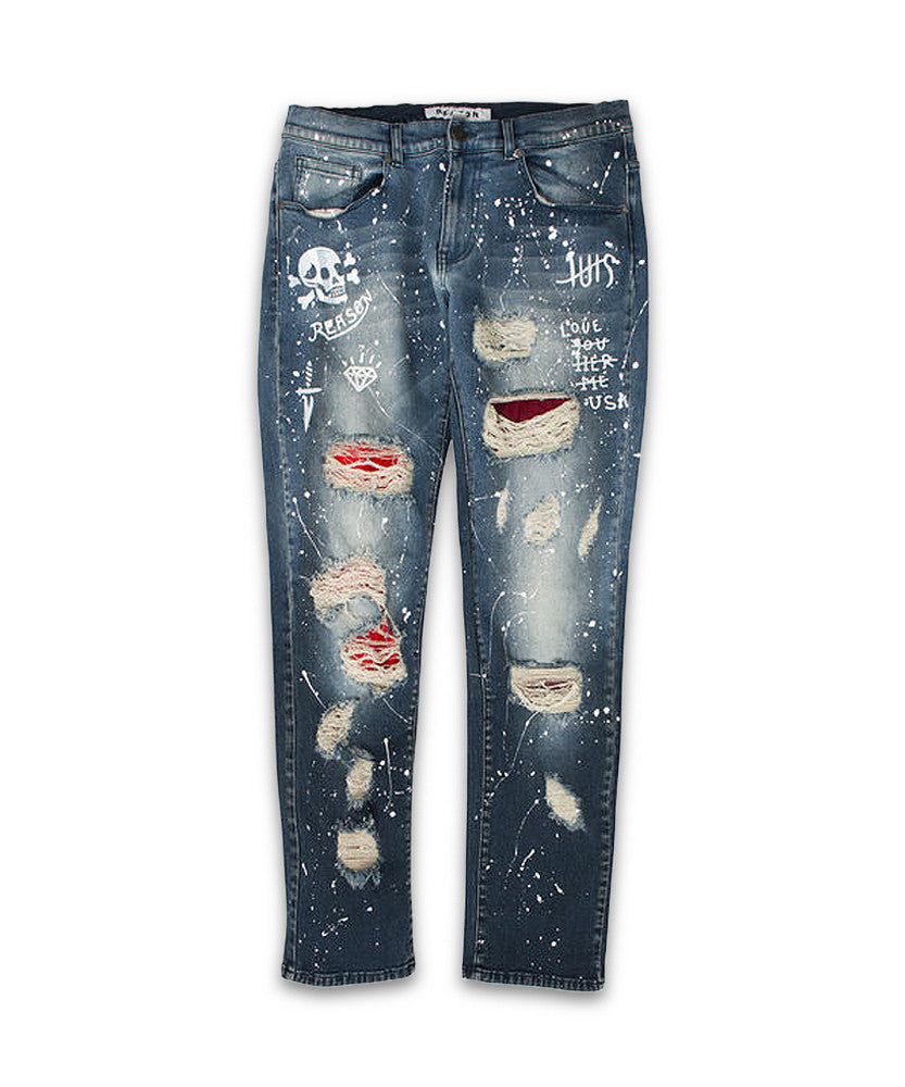 Premium 1% stretch denim with fade wash, distressing holes with red inset contrast panels, paint splatters, and painted Reason design.